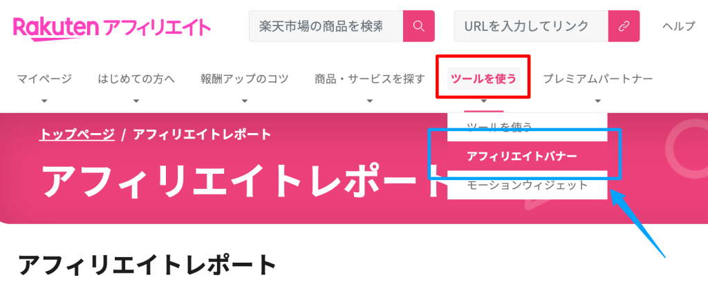以下のようにアフィリエイトページの上部メニュー「ツールを使う」>ア「フィリエイトバナー」をクリック。