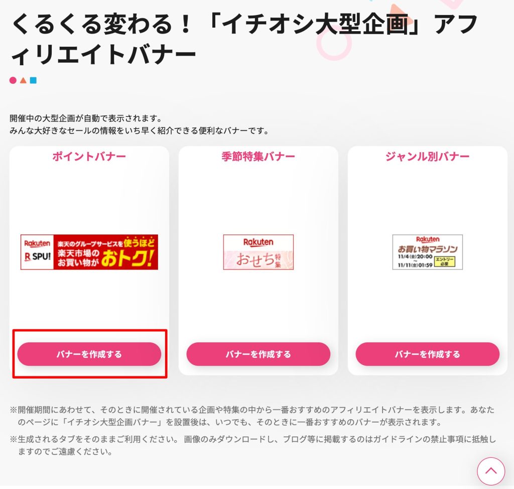 少しスクロールすると【くるくる変わる!「イチオシ大企画」アフィリエイトバナー】が表示されるので、ポイントバナーで「バナーを作成する」をクリック。