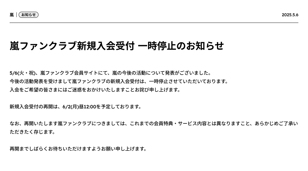 2025年のゴールデンウィーク最終日、嵐公式ファンクラブサイトにて「活動休止」ではなく「活動終了」のメッセージが発表されました。