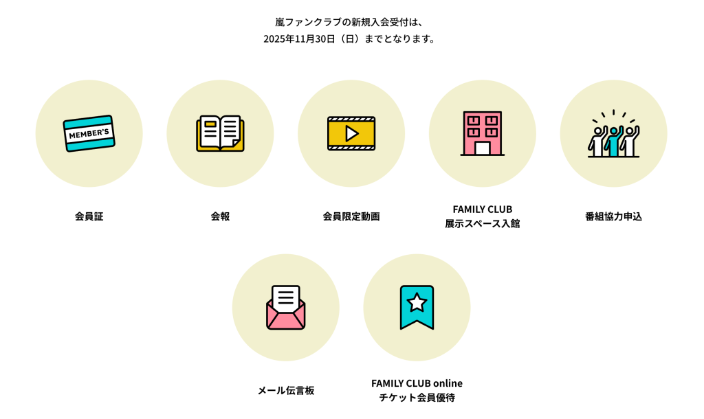 2025年6月2日以降に嵐のFC会員となった方は「チケット優先申込」や「バースデーカード」の特典はありませんのでご注意ください。