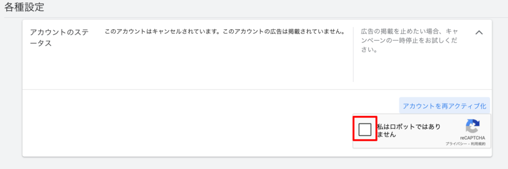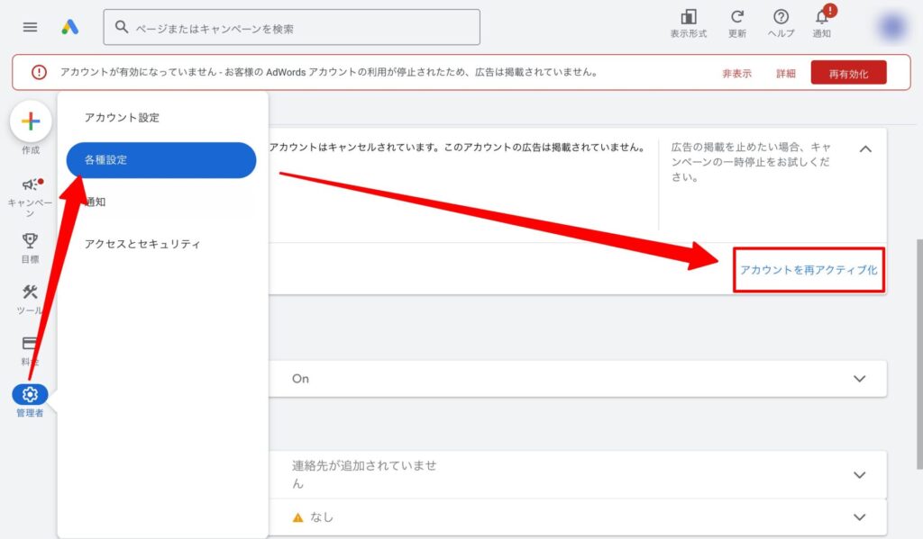 メッセージを完全に非表示にしたい場合や、本当に広告を出稿したい、あるいはすべてのGoogle広告の機能(キャンペーン管理画面など)を使いたい場合は、アカウントを有効に戻す必要があります。
