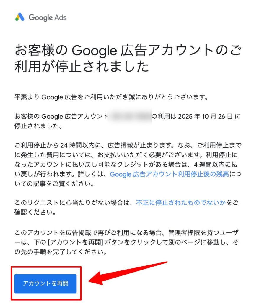 件名:お客様の Google 広告アカウント(XXX-XXX-XXXX)のご利用が停止されました。