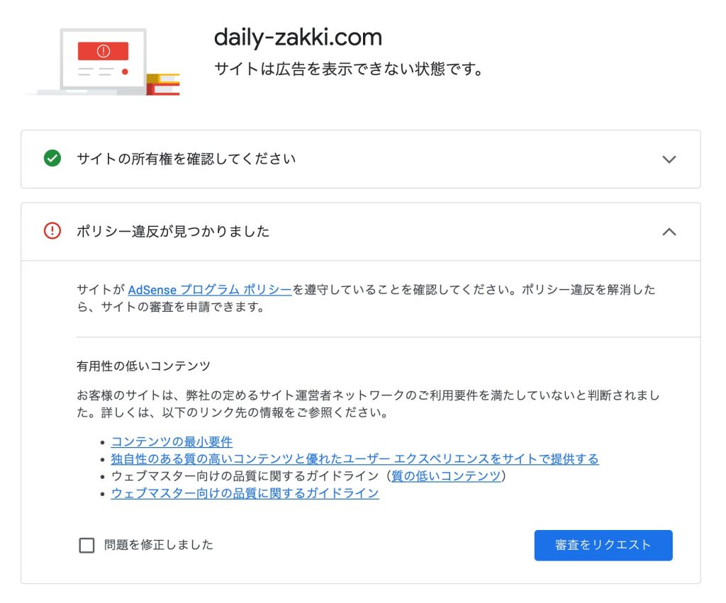 私が5回+雑記1回アドセンス申請で落ちたすべての理由が、この ポリシー違反が見つかりました 「有効性の低いコンテンツ」でした。