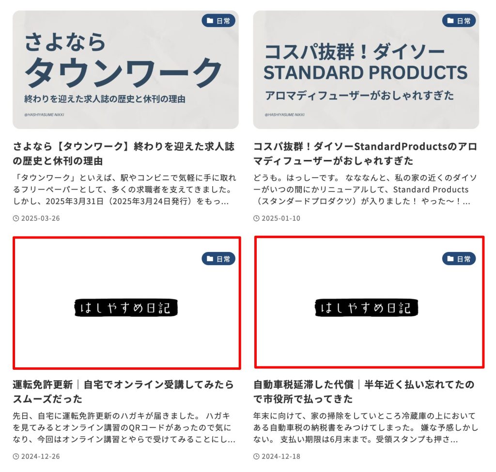 - 直近10記事はすべてアイキャッチ画像なし(グレースケールではなく、デフォルトのサイト画像)